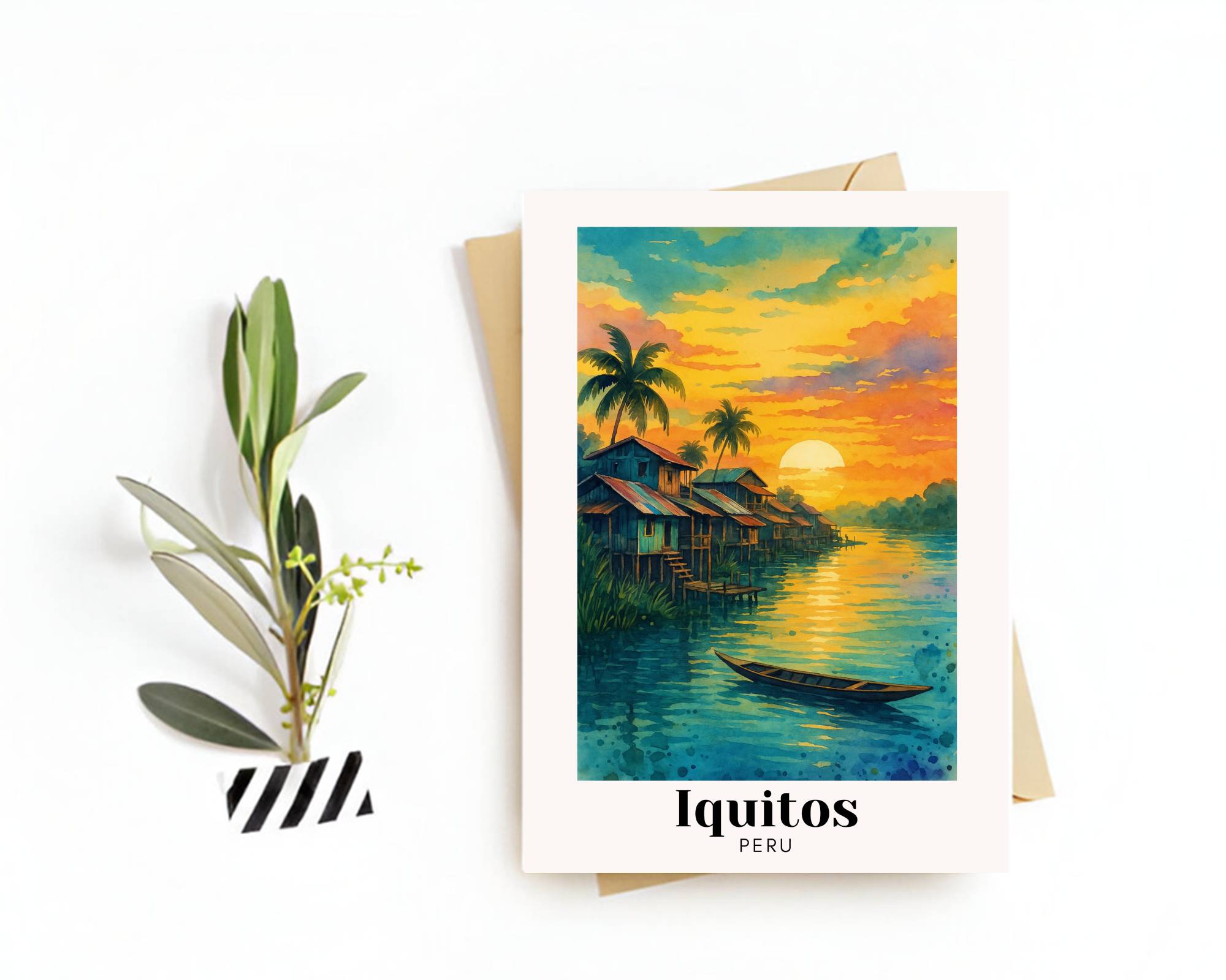 Discover the vibrant charm of Iquitos, Peru, with our stunning travel postcard. This beautifully designed greeting card captures the essence of the Amazon Rainforest, showcasing its lush greenery and unique wildlife. 🌿🐒 Whether sent to a loved one or kept as a cherished memento, this postcard is a perfect way to celebrate your travels or inspire wanderlust in others.